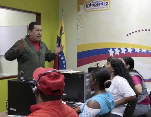 El comandante Hugo Chávez destaca a infocentro como un ejemplo de socialismo mediante la transferencia.