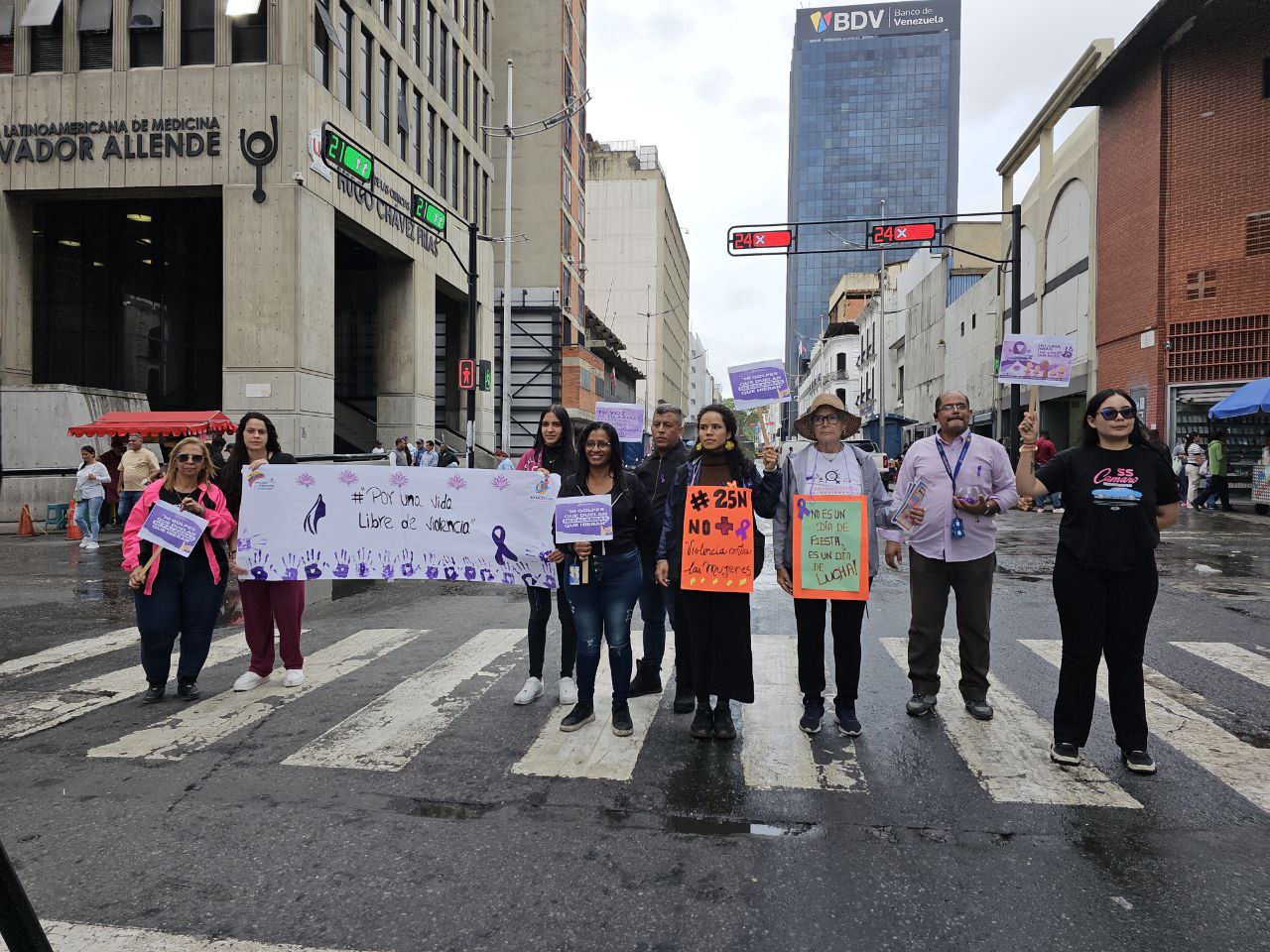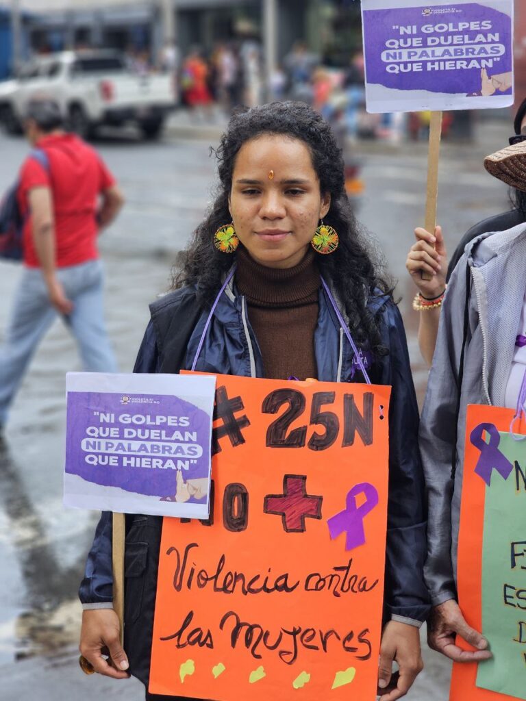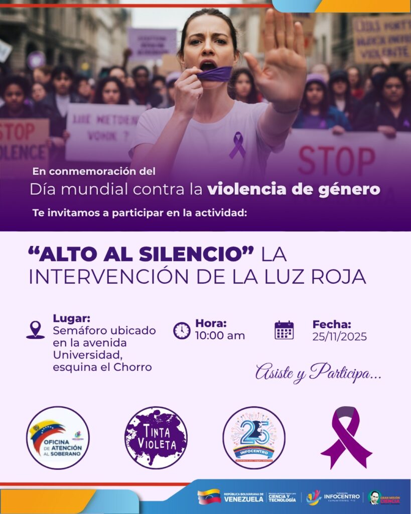 Durante la jornada, caracterizada por la mística revolucionaria y la solidaridad, se realizó una gran concentración donde el personal de Infocentro y el Mincyt, junto a las activistas de Tinta Violeta, portaron pancartas con mensajes contundentes alusivos a la fecha, captando la atención de conductores y peatones. De manera simultánea, se desplegó una jornada de sensibilización «cuerpo a cuerpo» mediante la entrega de trípticos informativos a los transeúntes; estos materiales, enriquecidos con la experiencia de la Fundación Tinta Violeta —reconocida red de organizaciones feministas que lucha contra la violencia machista y la discriminación—, brindaron herramientas claves para la prevención y la denuncia. Esta interacción directa permitió romper la indiferencia y llevar un mensaje educativo y de apoyo a la ciudadanía, fomentando la construcción de una cultura de paz y respeto mutuo.