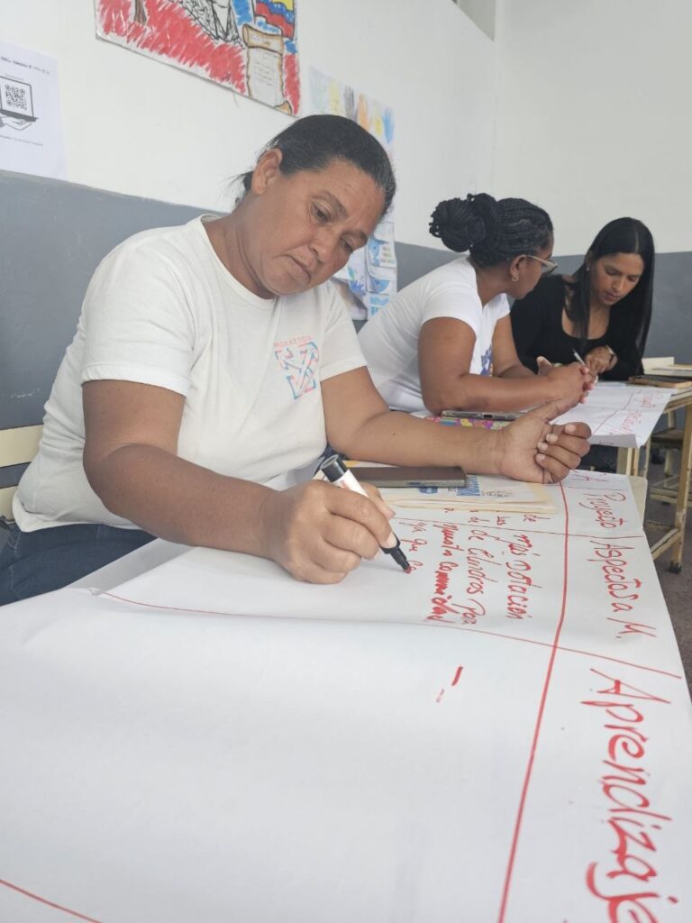 La actividad se desarrolló en la Unidad Educativa Nacional Ezequiel Zamora entre las 10:00 am y 3:00 pm., con una metodología enmarcada en la Educación Popular, que permitió a las y los participantes, en un circuito con tres estacones, recibir formación en el área de fotografía, elaboración de videos y planificación territorial a través del mapa digital. Posteriormente se intercambiaron experiencias en el desarrollo de las acciones contempladas en las Agendas Concretas de Acción de cada comuna, con la intención de identificar aspectos positivos y aprendizajes que permitan a las comunas del territorio entre ayudarse, para superar dificultades de manera colectiva de acuerdo con los aspectos positivos que cada una de ellas pudieron compartir durante el encuentro. Para ello, se utilizó la estrategia del cuadro de amarre, en donde varias comunas se pusieron de acuerdo para el desarrollo de procesos formativos en los que unas tenían debilidades y otras fortalezas.