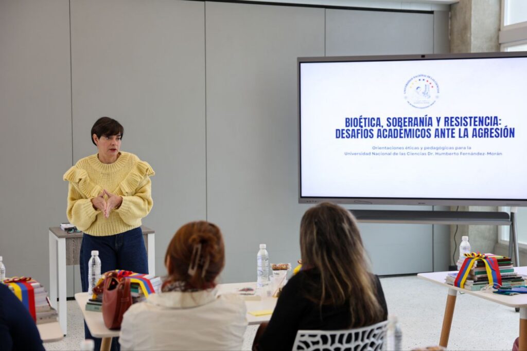 La rectora de la Universidad Nacional de las Ciencias Dr. Humberto Fernández-Morán, Gabriela Jiménez Ramírez, destacó la importancia de la bioética como eje formativo y humano para acompañar a la comunidad universitaria frente al impacto de los bombardeos perpetrados por Estados Unidos (EEUU).